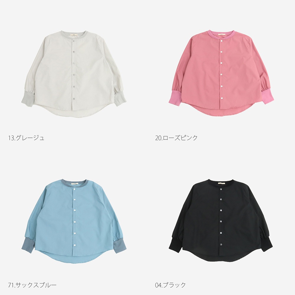 軽くてハリコシのあるハウスシャツです。同色のお袖のリブがアクセントになっています。後ろ丈が少し長くなっており、スカートともパンツとも相性よく着れます。