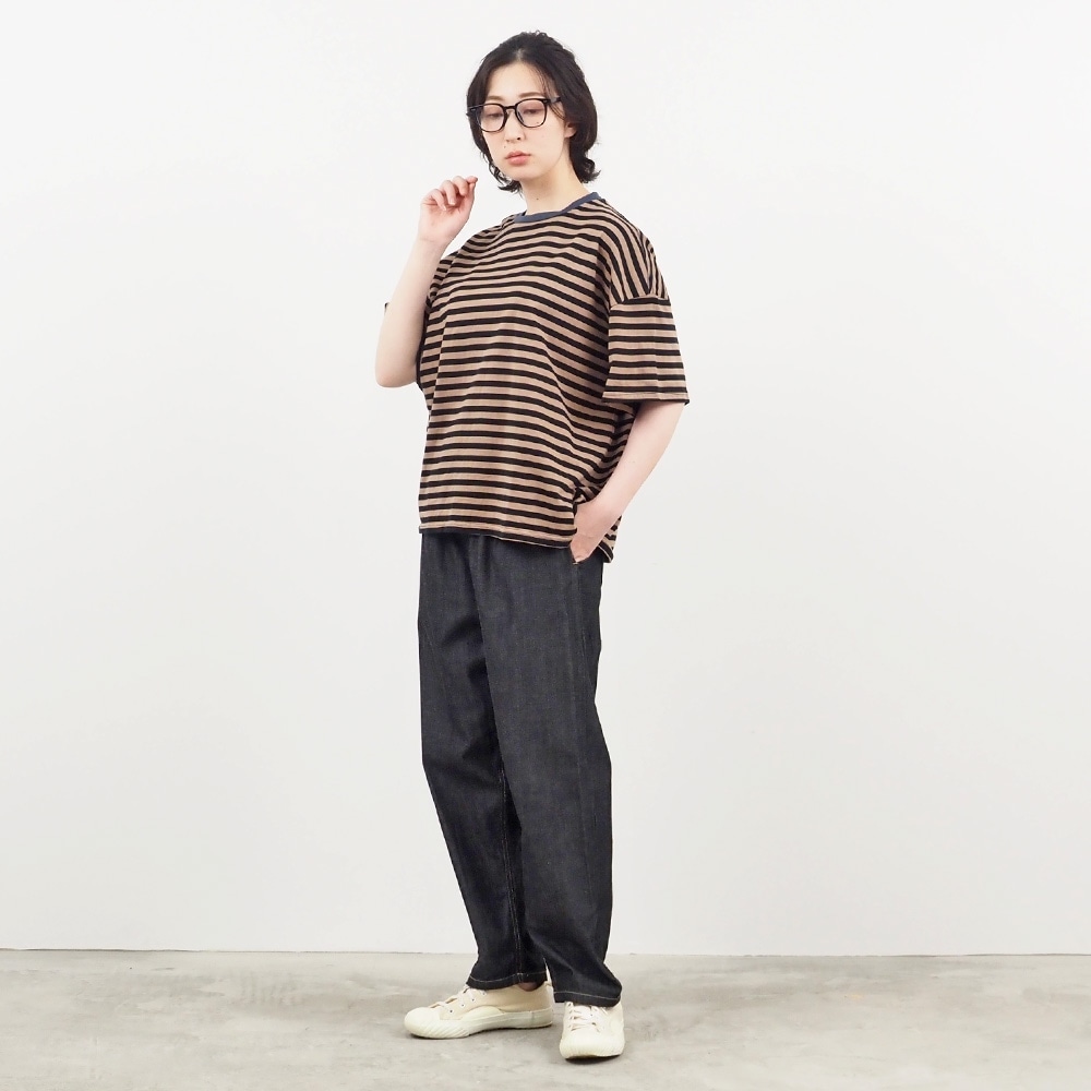 ゆったりとしたシルエットながら、コンパクトなボーダーTが全体をすっきり見せてくれます。