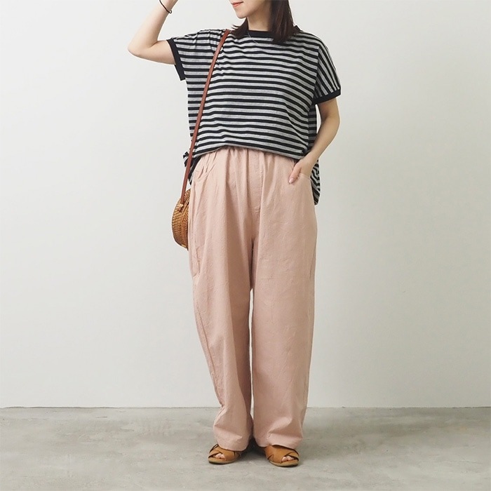 リラックス感のあるボーダーTシャツに、淡いピンクのパンツを合わせた大人カジュアルな夏コーデ。