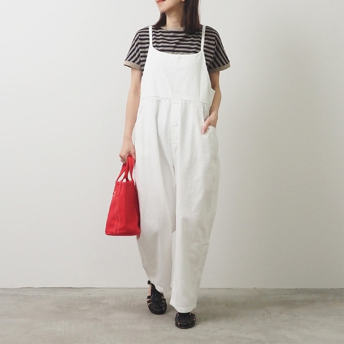 白のオーバーオールにシックなボーダーTシャツを合わせた、大人のサロペットコーデ。