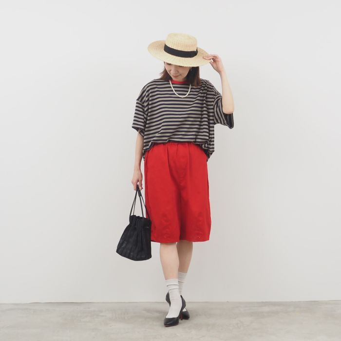 ボーダーTシャツと鮮やかな赤のハーフパンツを合わせた、夏らしい大人カジュアルコーデ。