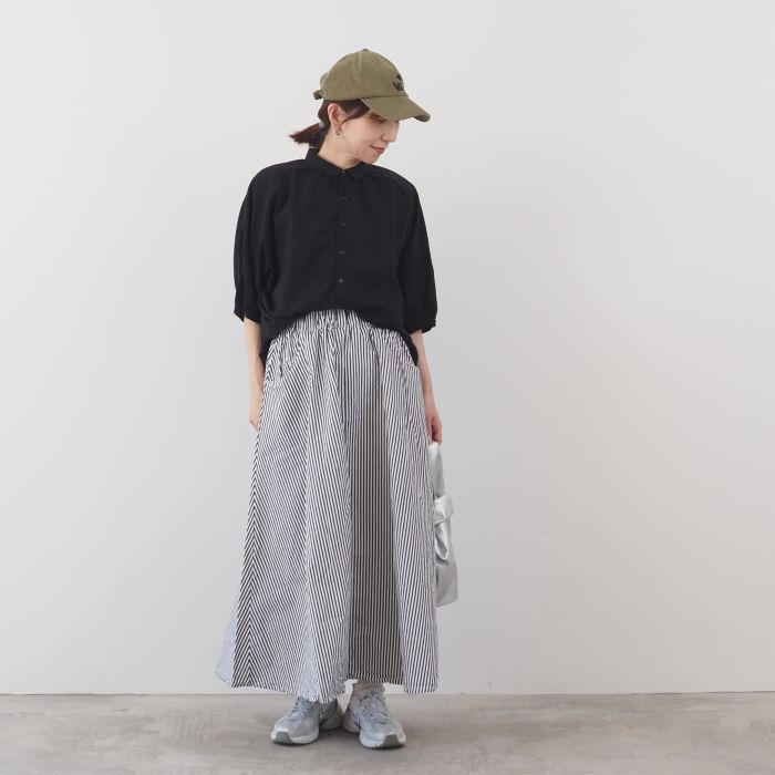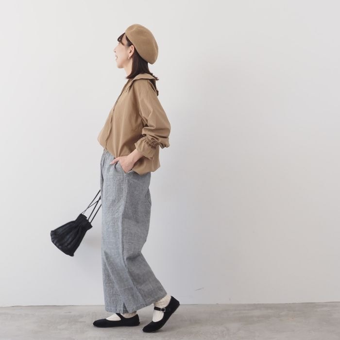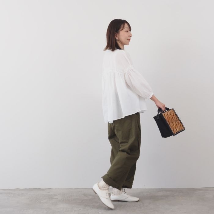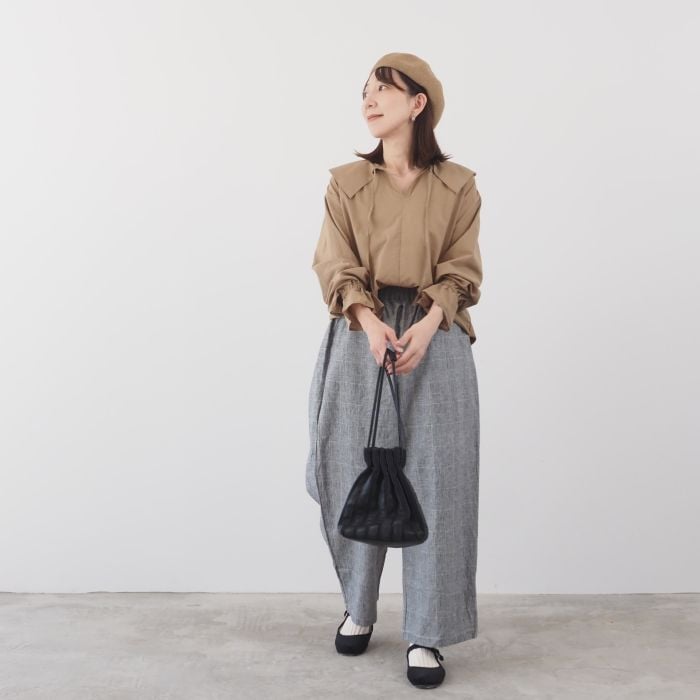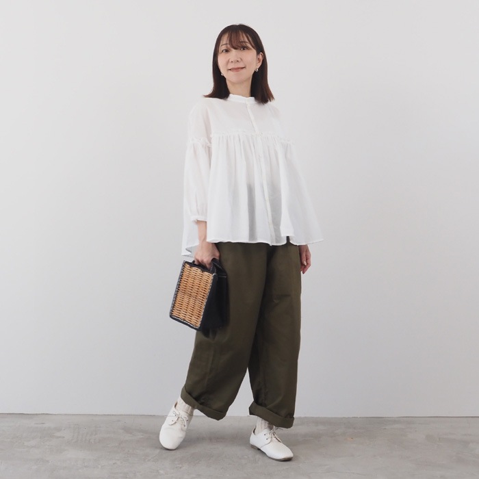 ブラウスはゆったりとしたシルエットとボリューム袖が特徴で、体のラインを拾わず自然な抜け感を演出。