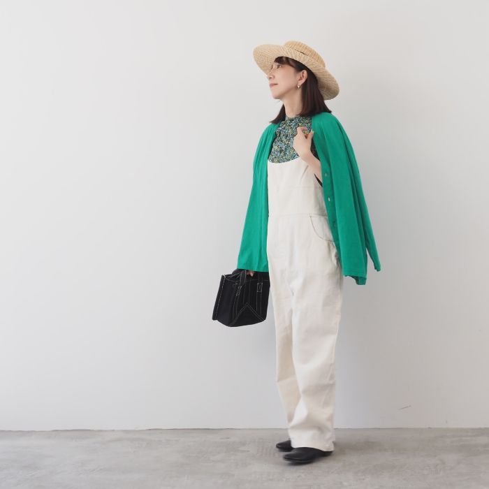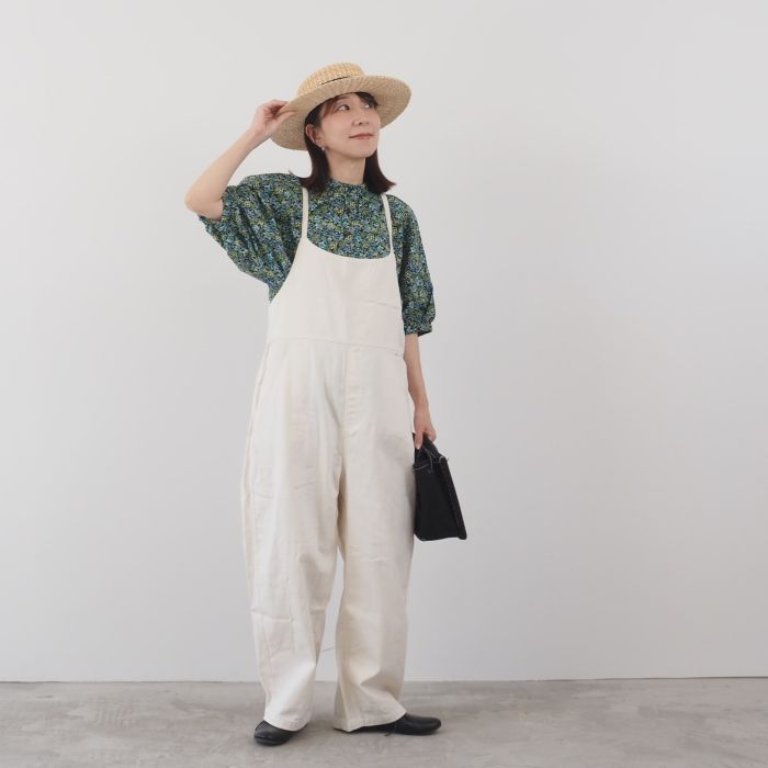 ホワイトのサロペットはリラックス感のあるシルエットで、ブラウスの甘さを程よく中和し、ナチュラルでこなれた印象に。