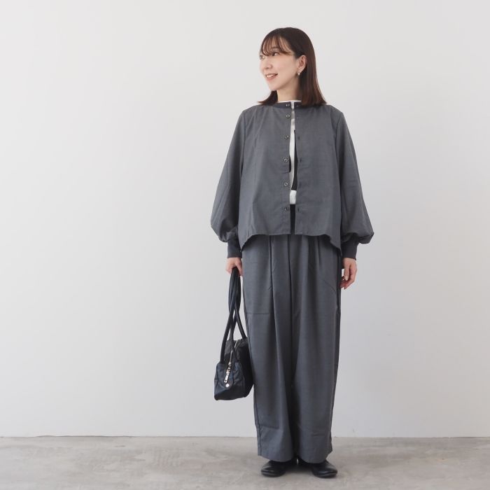 前ボタンを留めてセットアップの同色のワイドパンツを合わせることで、統一感のあるすっきりとした印象に。