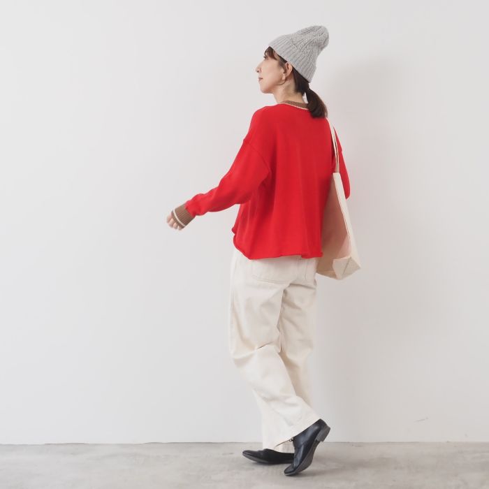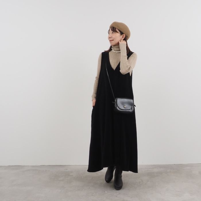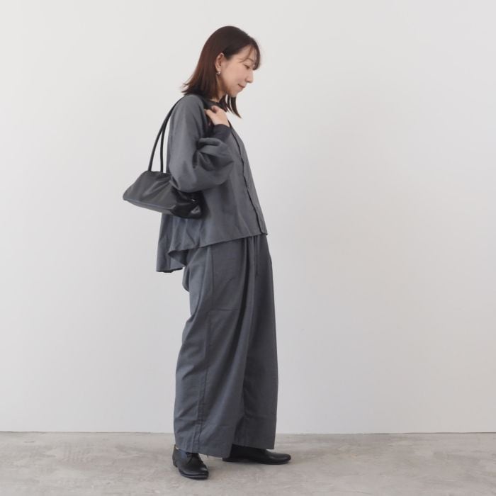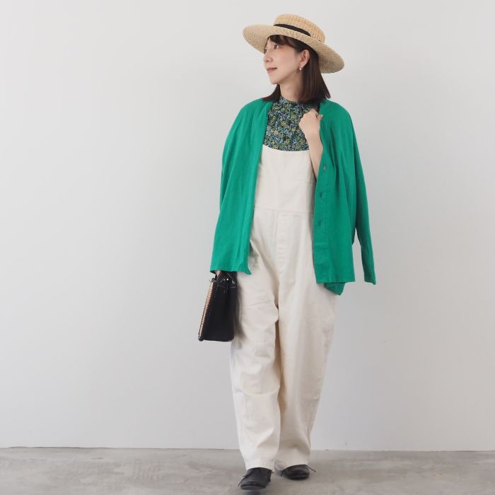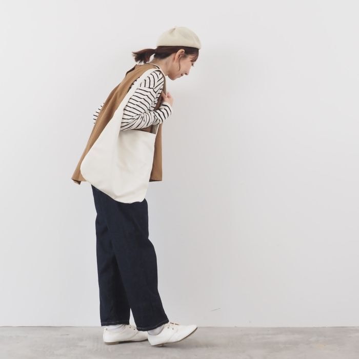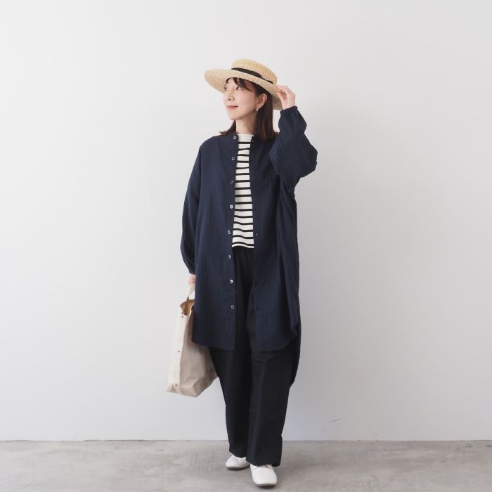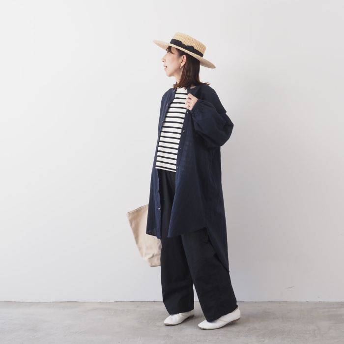 インナーのボーダーTで程よくカジュアル感を添えつつ、全体をネイビーとブラックでまとめることで落ち着いた印象に。 足元は白のシューズで抜け感を出し、ナチュラルな季節感をプラス。