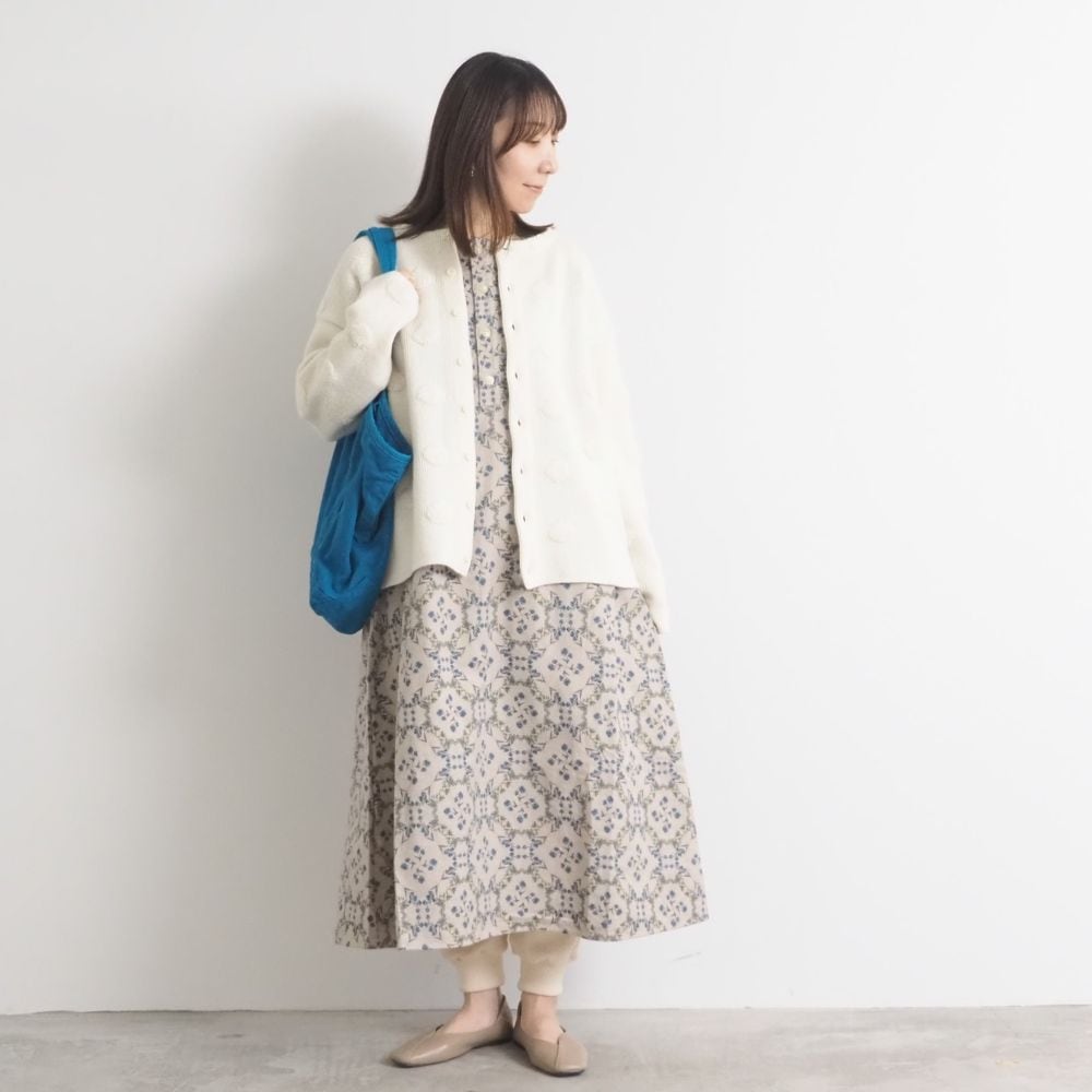 やわらかなベージュトーンでまとめた冬のワントーンコーデ。ナチュラルな色合いのワンピースに、軽やかな白の羽織りとニットパンツを重ねることで、淡色でもぼやけず、ほどよい立体感が生まれます。