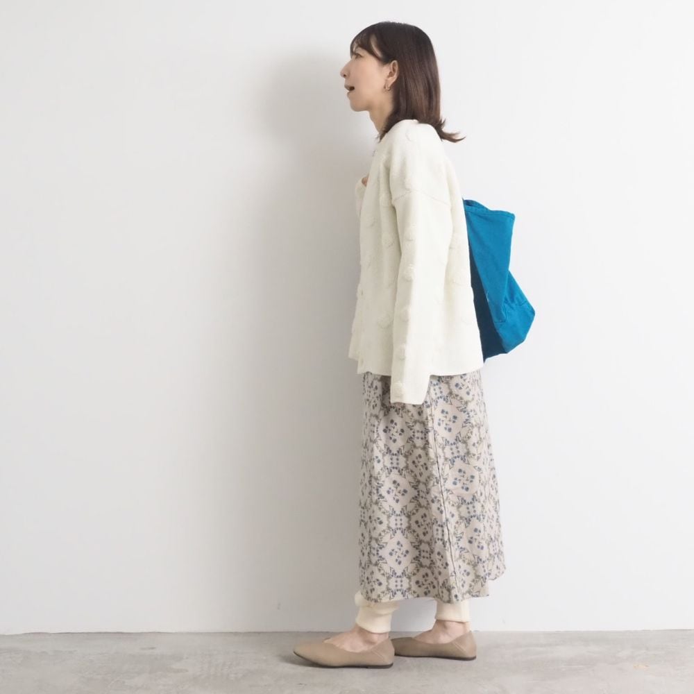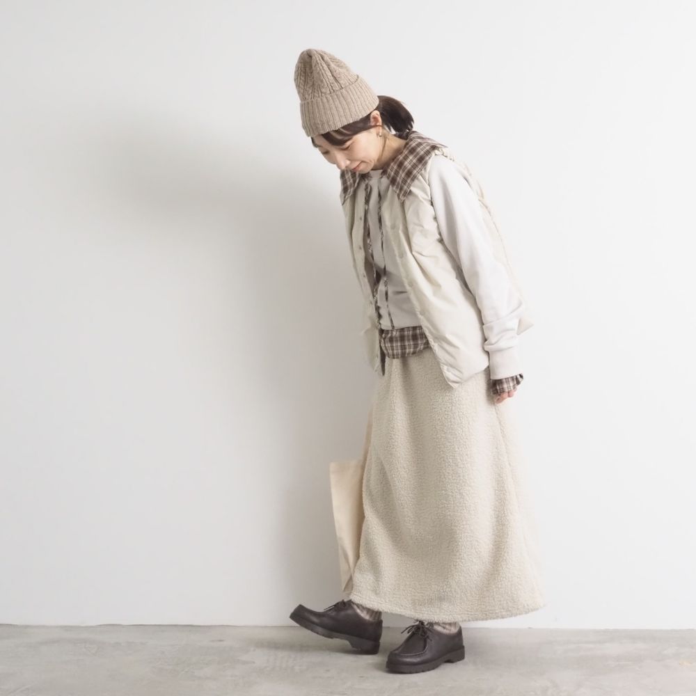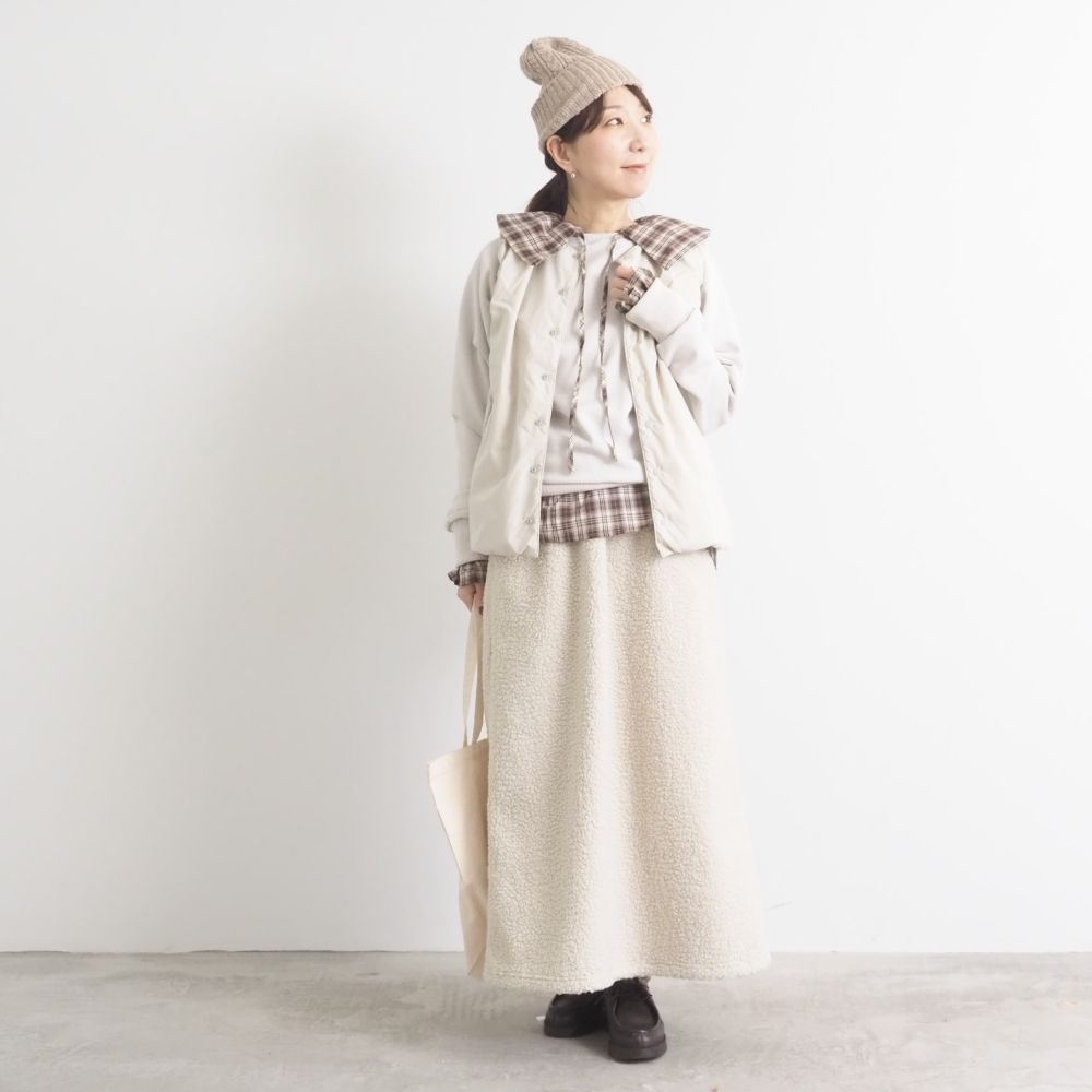 軽やかなアウターともこもこスカートの素材感の違いで、淡色でものっぺり見えず、自然な立体感を演出しています。