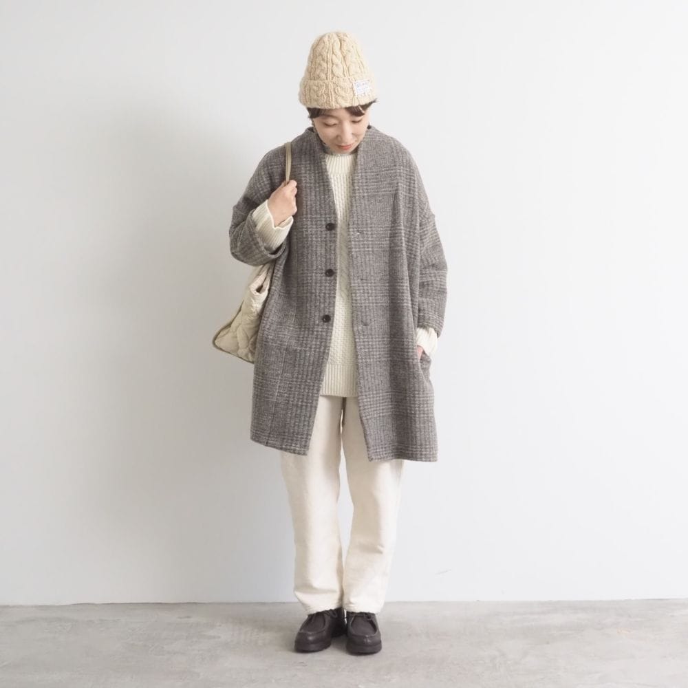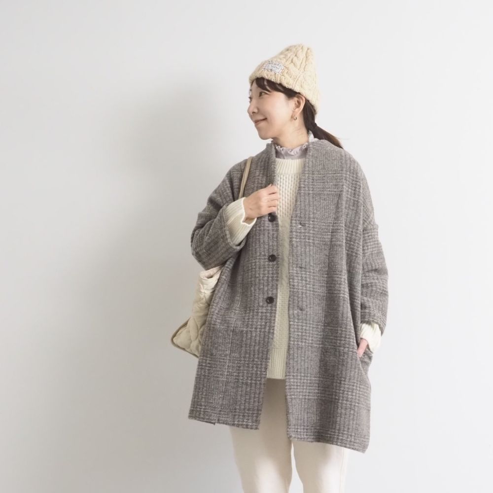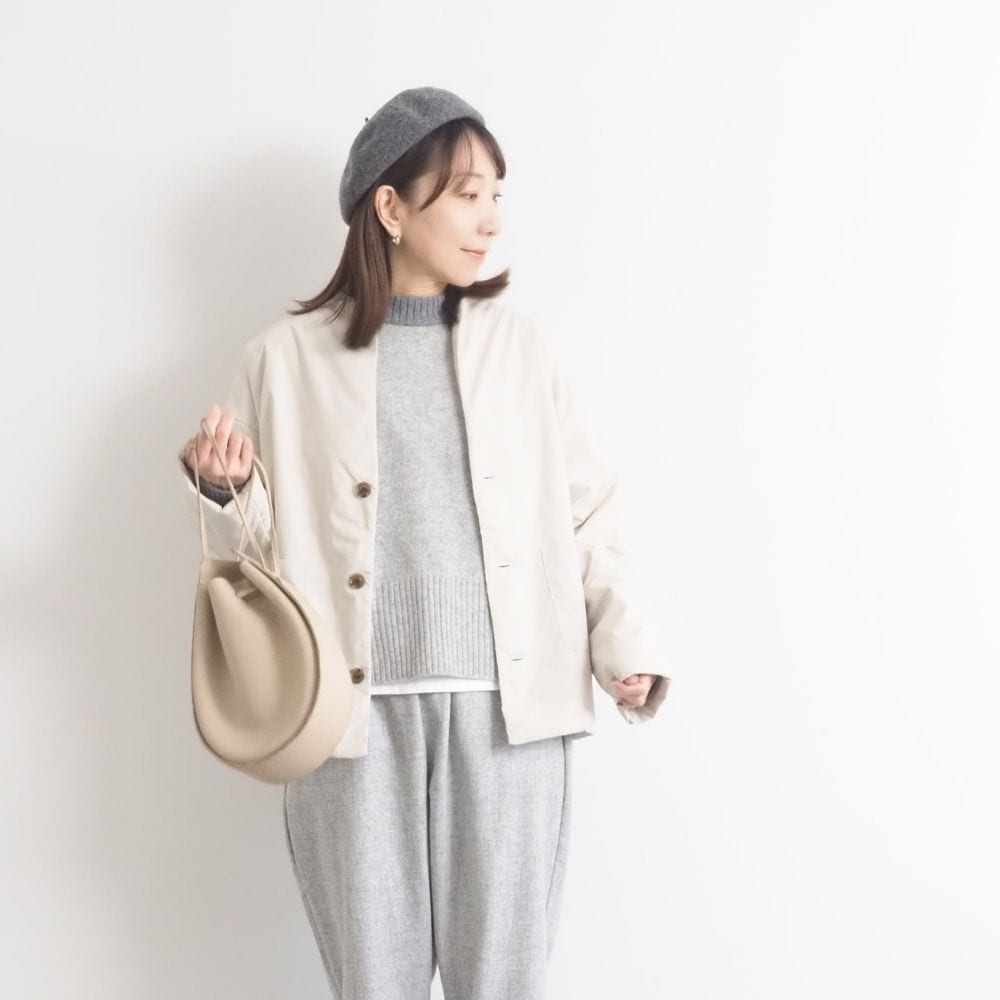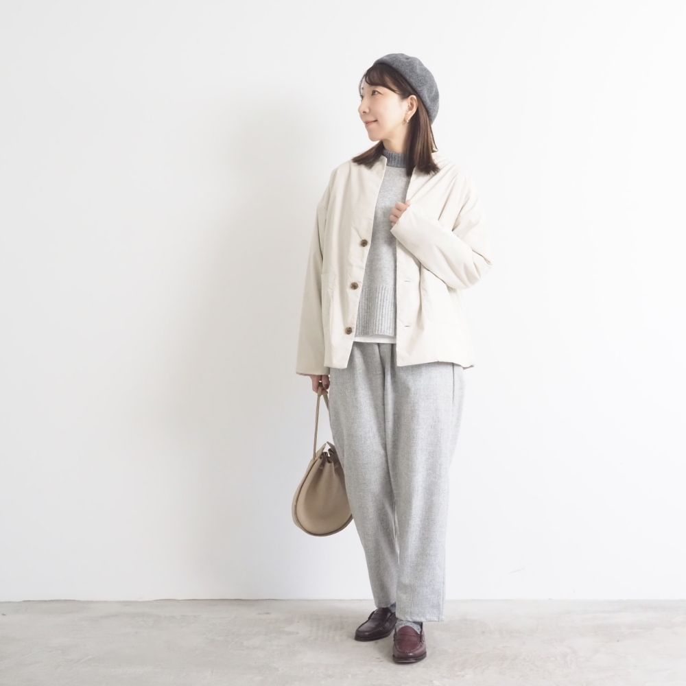 白とグレーを重ねた軽やかさのある冬のワントーンコーデ。やさしい白アウターが全体を明るく引き上げ、グレーのニットとパンツで奥行きのある表情に仕上げています。