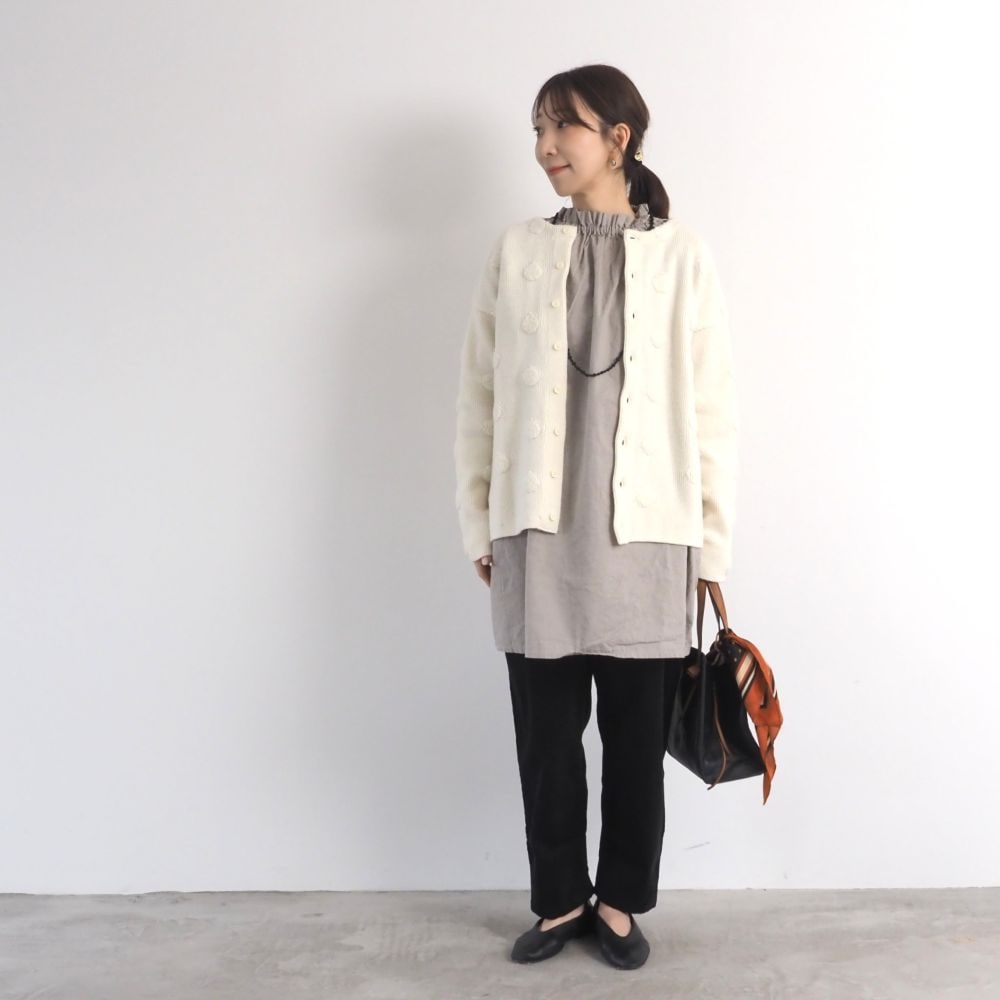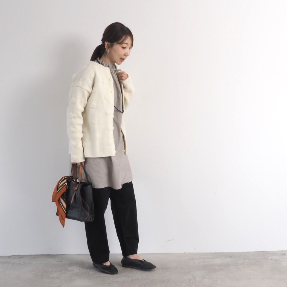やわらかなアイボリーのカーディガンを主役に、落ち着いたトーンでまとめたナチュラルなオケージョンスタイル。