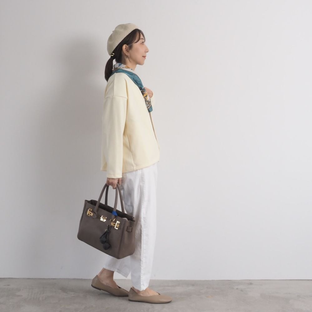 グレーのインナーでほどよく引き締めつつ、白のパンツで明るさと清潔感をプラスしました。