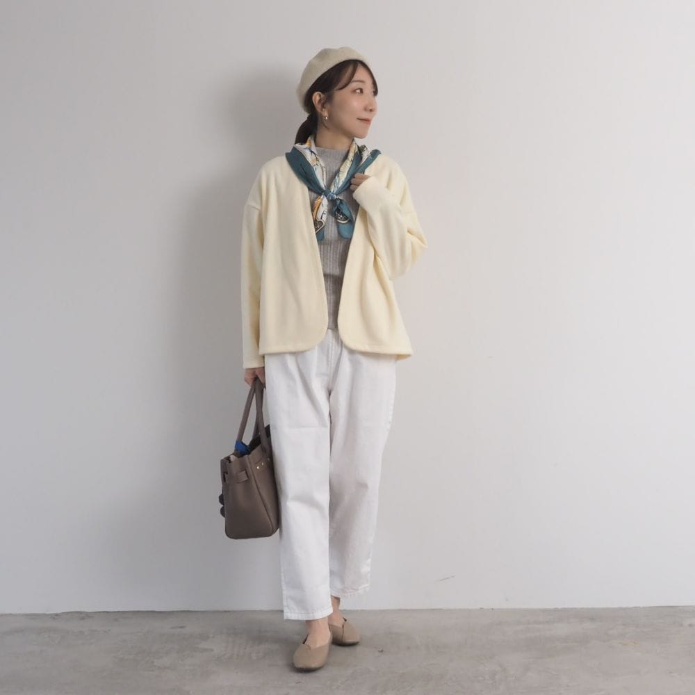 首元に添えたスカーフがさりげない華やかさを演出し、全体をやさしくまとめてくれます。