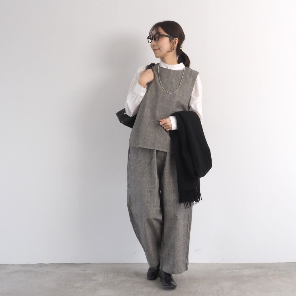 ベストとパンツを同素材で揃えた、落ち着きのあるセットアップスタイル。