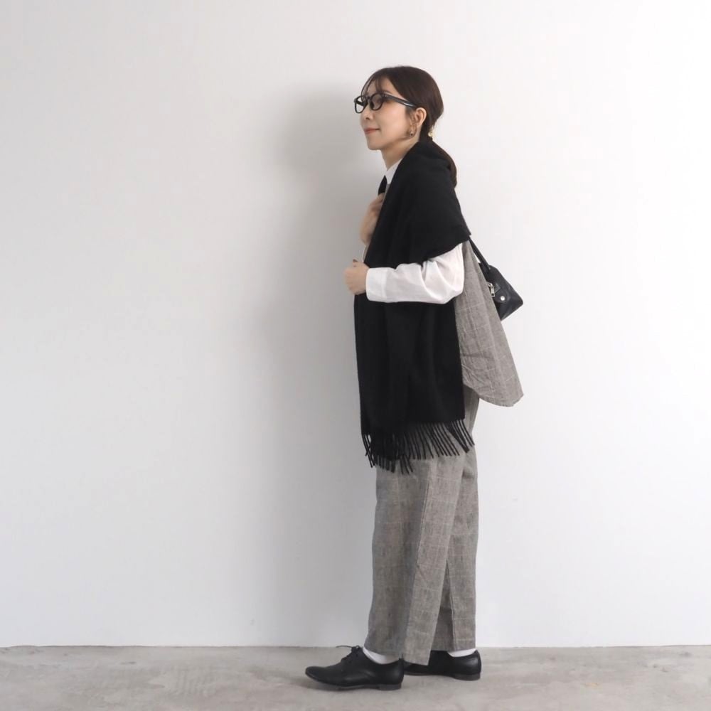 黒のインナーを合わせることで全体が引き締まり、ほどよくきちんとした印象に仕上がります。