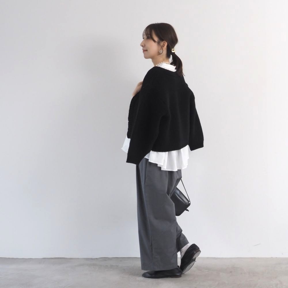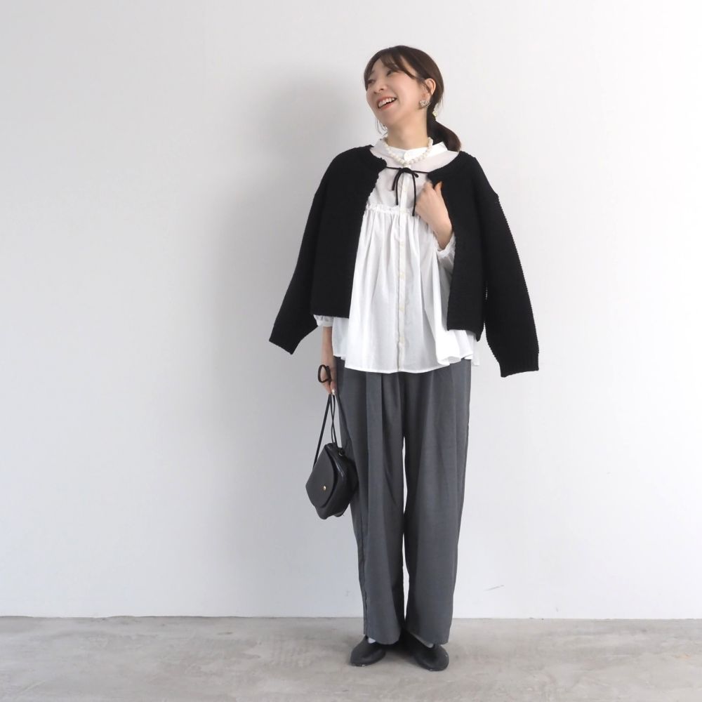 やわらかな白ブラウスを主役に、黒のカーディガンを軽く羽織ったモノトーンスタイル。