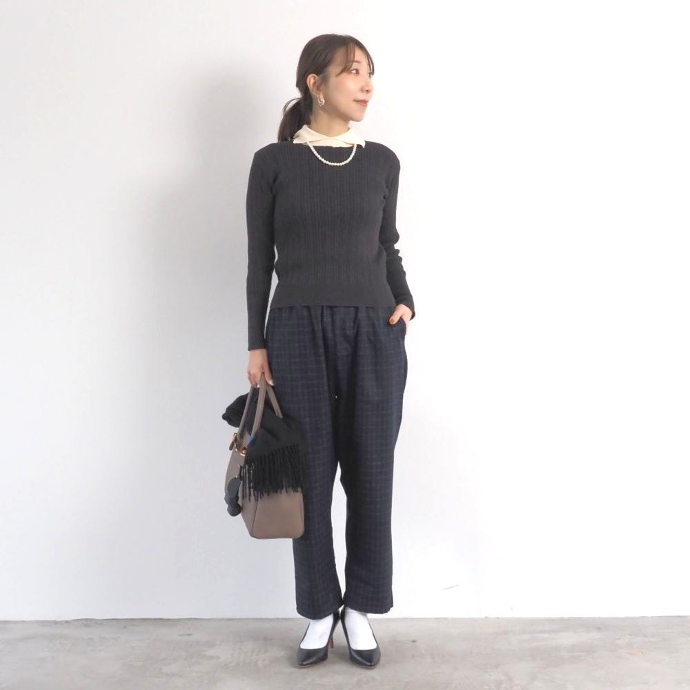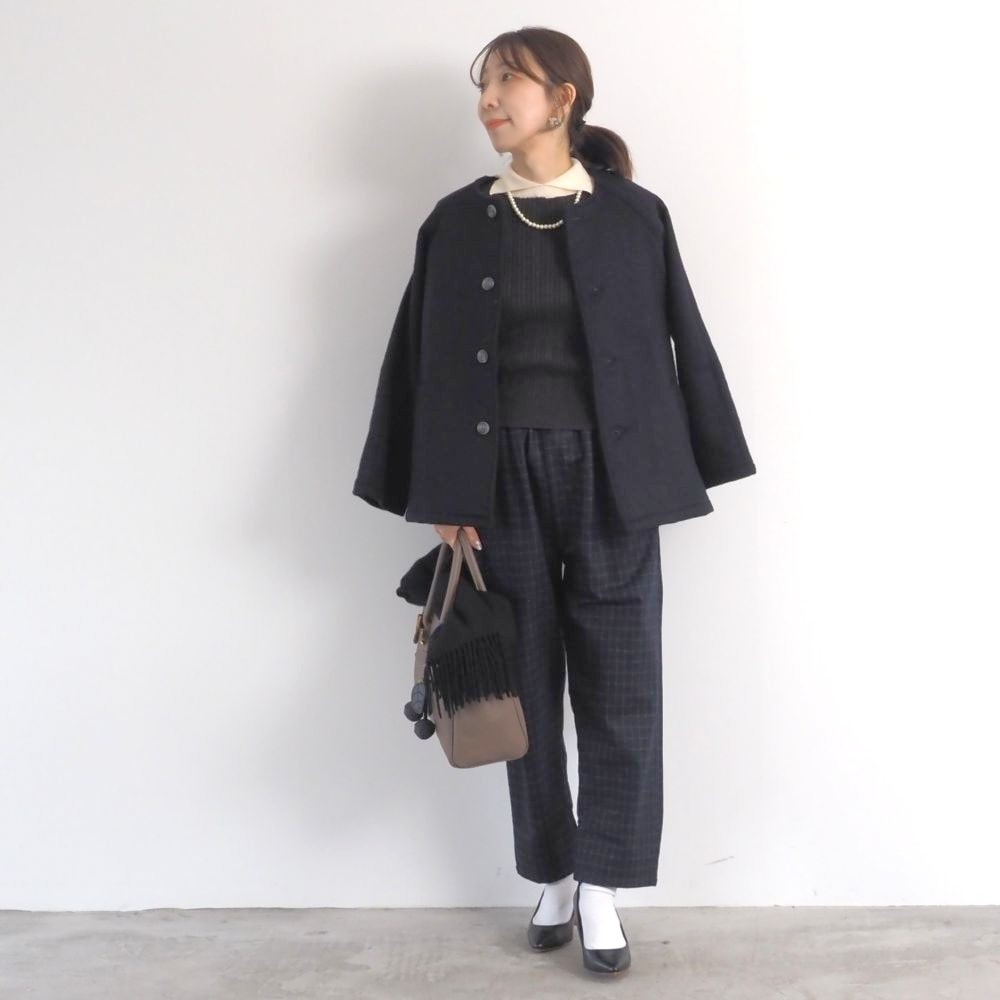 チャコールグレーの襟付ニットに、ネイビーのコートとチェックのパンツを合わせた落ち着きのある配色のオケージョンスタイル。
