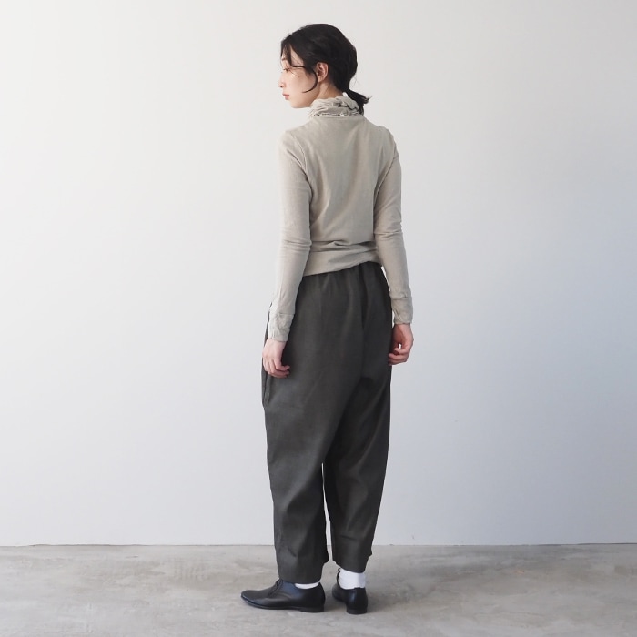 袖口と裾にねじりを加えることで立体感を作り出し1枚でさらりと着用できるデザインになっています。裾が少し長めで二重になっておりシャツなどを着たときにチラッと見せるのもグッド。