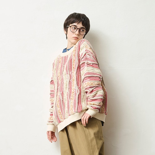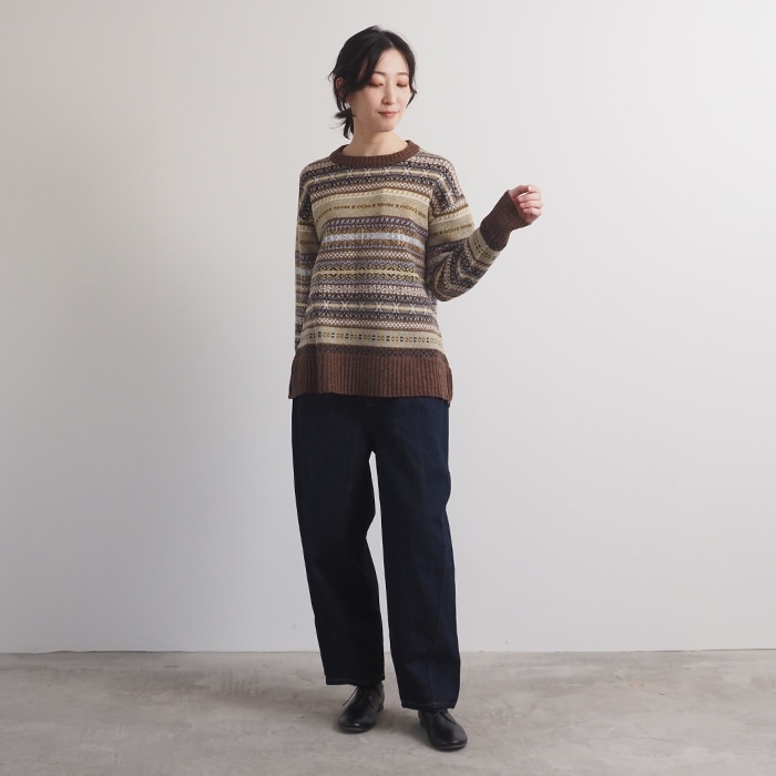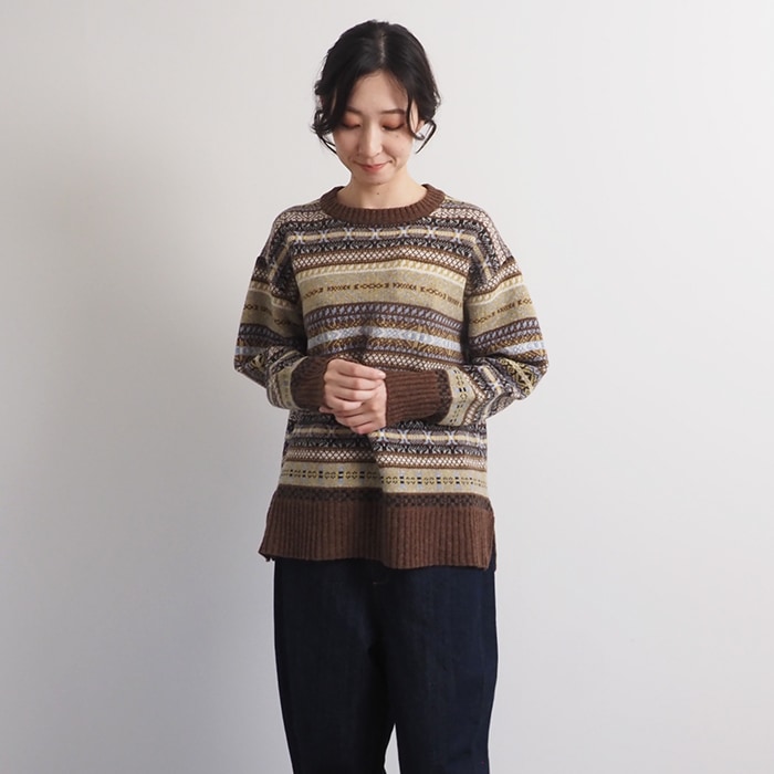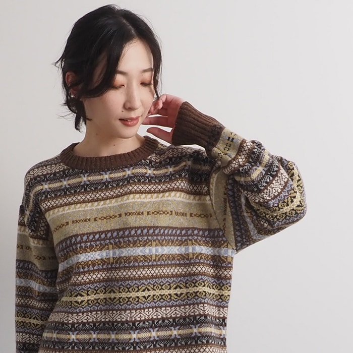 ヴィンテージ感のあるフェアアイル柄が個性的なリシェスフェアアイル柄クルーネックセーターのご紹介です。ほっこりしたカラー配色が可愛らしく、温かみのあるアイテムと合わせても相性のいいアイテムです。