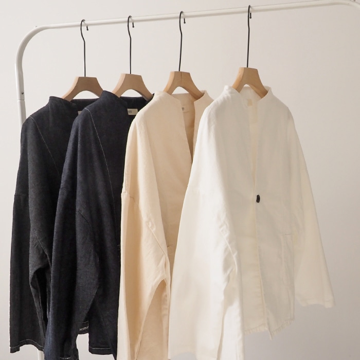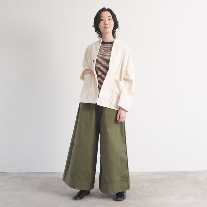 程よくゆとりのあるシルエットで、カットソーはもちろん、ニットの上からでも羽織りやすい設計。春や秋の軽いアウターとして長く活躍してくれる一着です。
