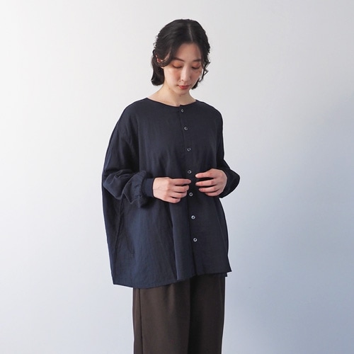 表面感のある素材で清涼感たっぷりな先染シャーリングシャンブレー スタンドカラーシャツです。柔らかな風合いで肌触りの良い着心地が特徴。夏の持ち運び用カーディガンとしても重宝する薄手のシャツです。