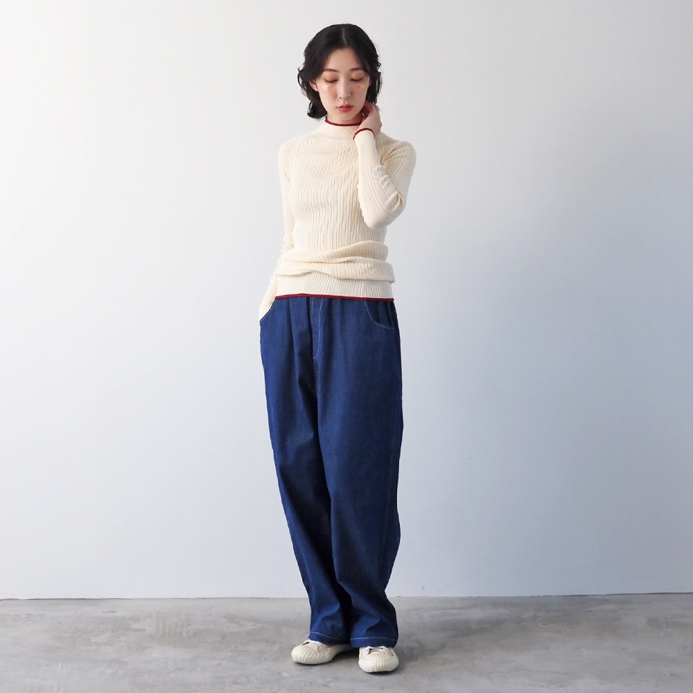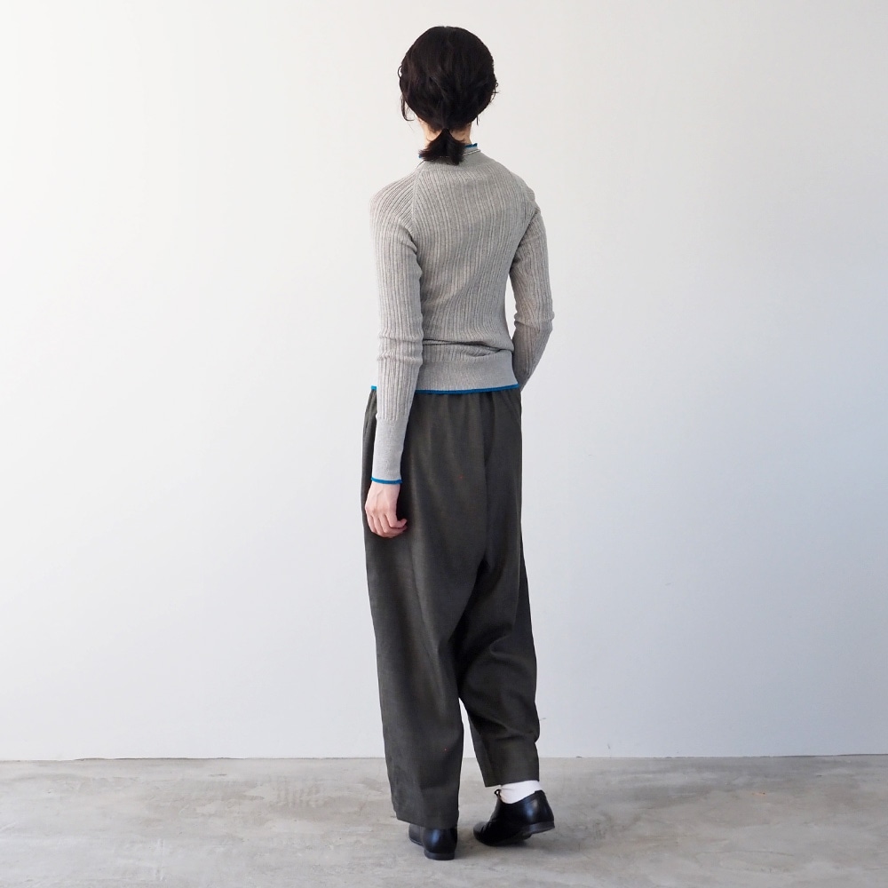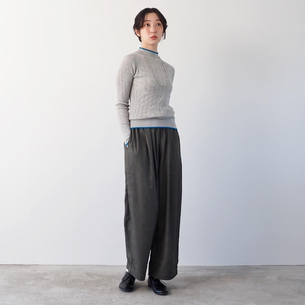首元や袖口、裾にあしらわれた配色ラインが、シンプルな中にさりげないアクセントをプラス。一枚で着ても、インナーとして重ねても、配色の効果でスタイリングが引き締まり、どこか特別な雰囲気を演出します。