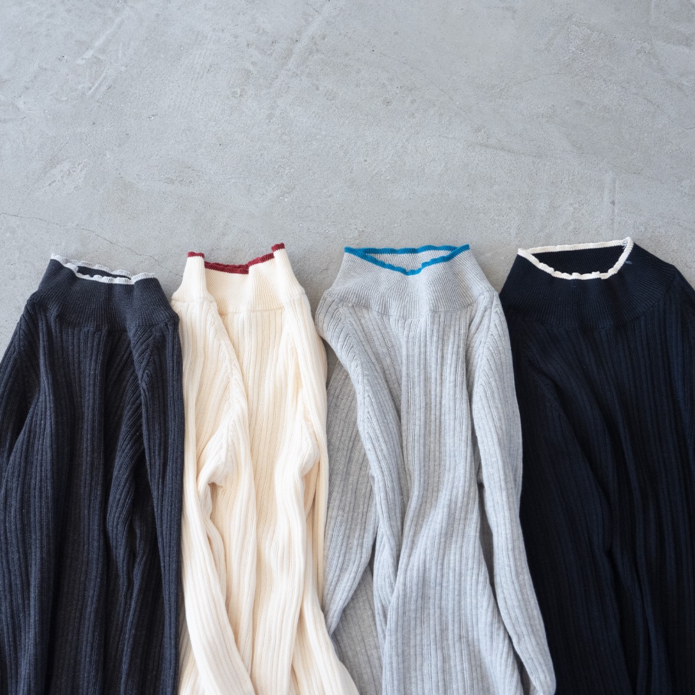 シンプルなのに、どこか特別。毎日に寄り添うランダムリブニット バイカラーハイネックニットです。すっきりとした縦ラインを描くリブ編みが、女性らしいシルエットを自然に引き立ててくれる一枚。