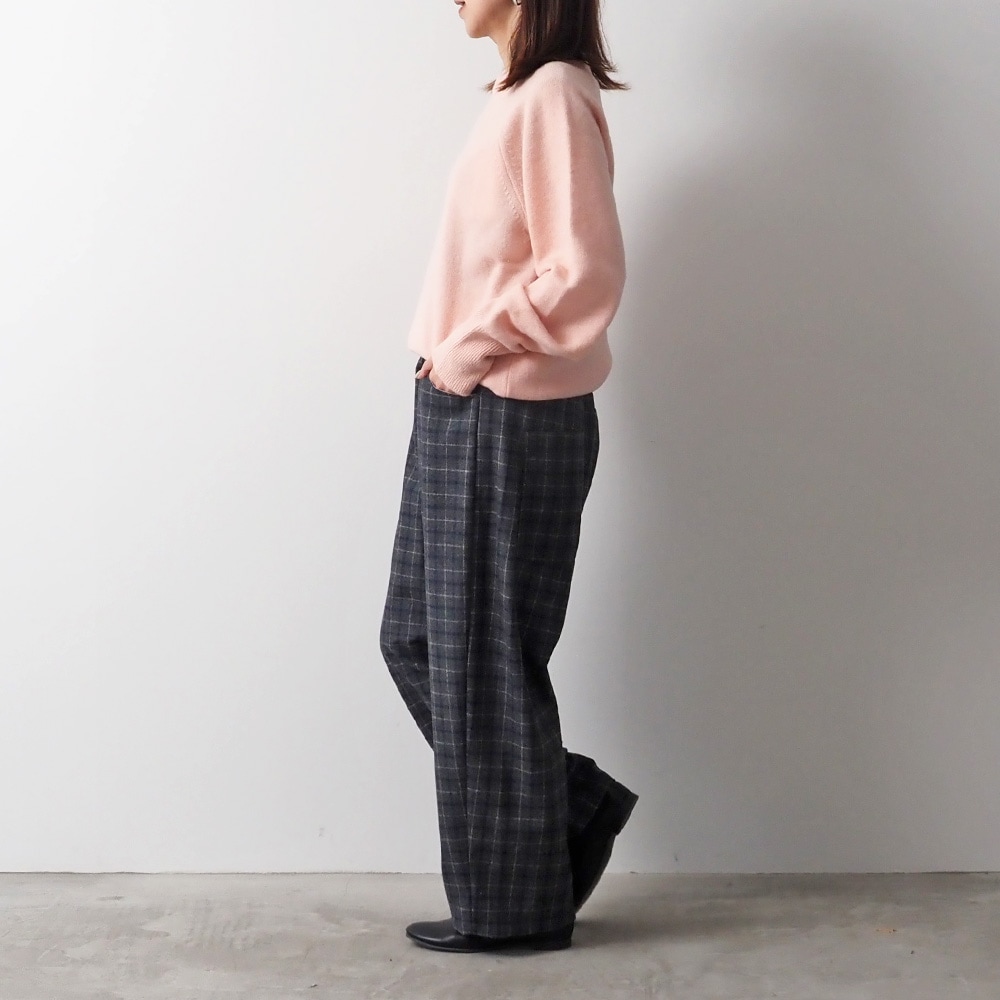 秋冬らしいチェック柄を、上品で軽やかに仕立てた、ウールリサイクルクロスチェック ノッポパンツです。ノッポパンツのゆったりルーズなストレートシルエットで気になる体型もカバーしてくれます。