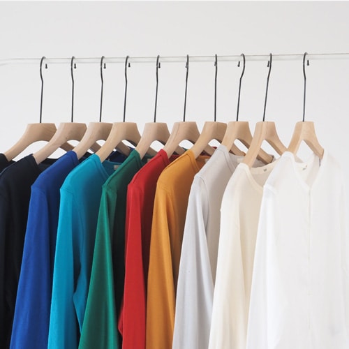 強撚糸を使用したガーゼフライス素材で、さらりとした肌離れのよさと、やわらかな風合いを兼ね備えた一枚。表面はわずかにシャリ感があり、汗ばむ季節にも心地よく着られるのが魅力です。