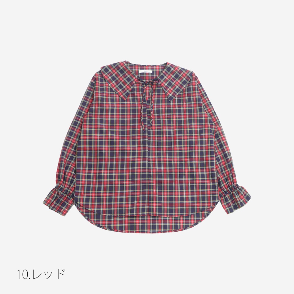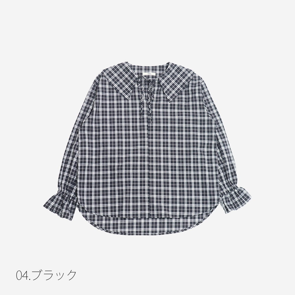 大きめのセーラーカラーが目を引く、ナチュラルフェミニンな印象のチェック柄ブラウスです。胸元はスキッパーデザインで、ほどよく開いたVネックにリボンをあしらっています。