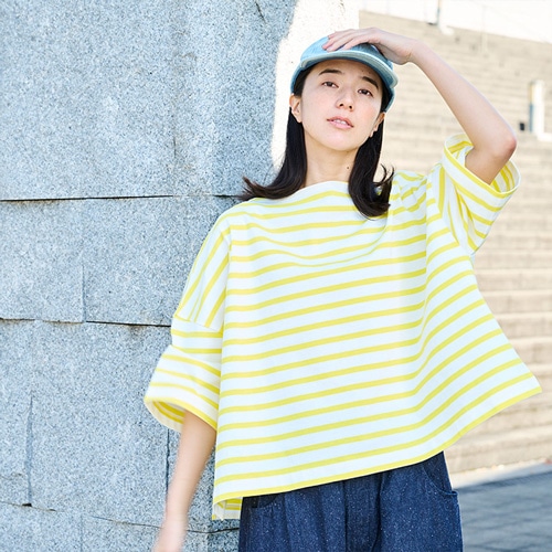 フロントには、定番のボーダーに遊び心を加えた曲線ライン。シンプルながら印象的で、コーディネートの主役になるデザインです。