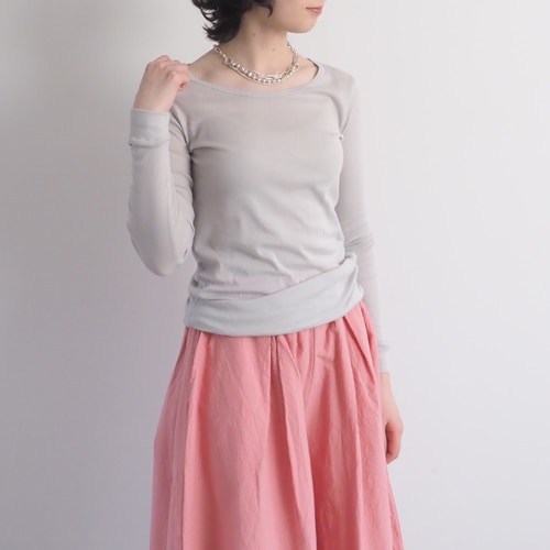 天竺素材にほんのり起毛をかけた、秋冬にぴったりのあたたか素材です。ほどよい毛羽立ちで、フィブリル加工のような上品な表面感に。なめらかなタッチで肌あたりがやさしく、心地よい着心地を叶えます。