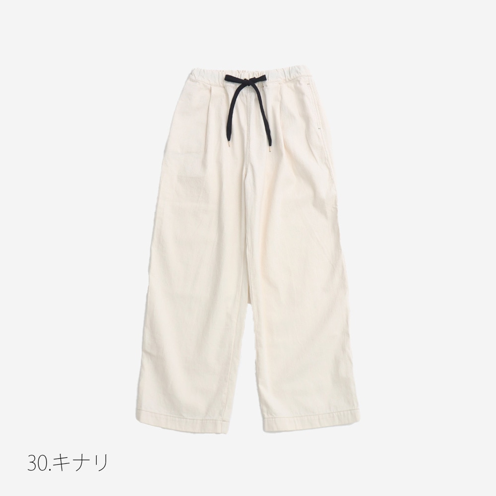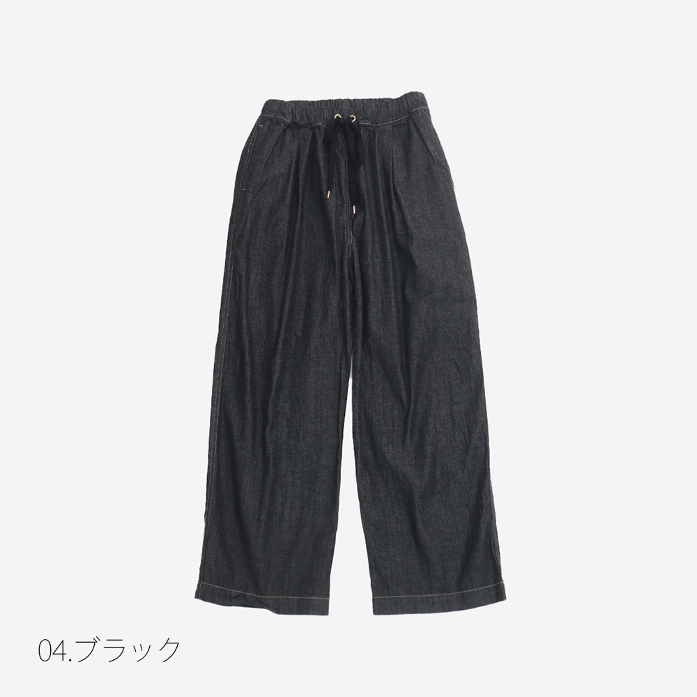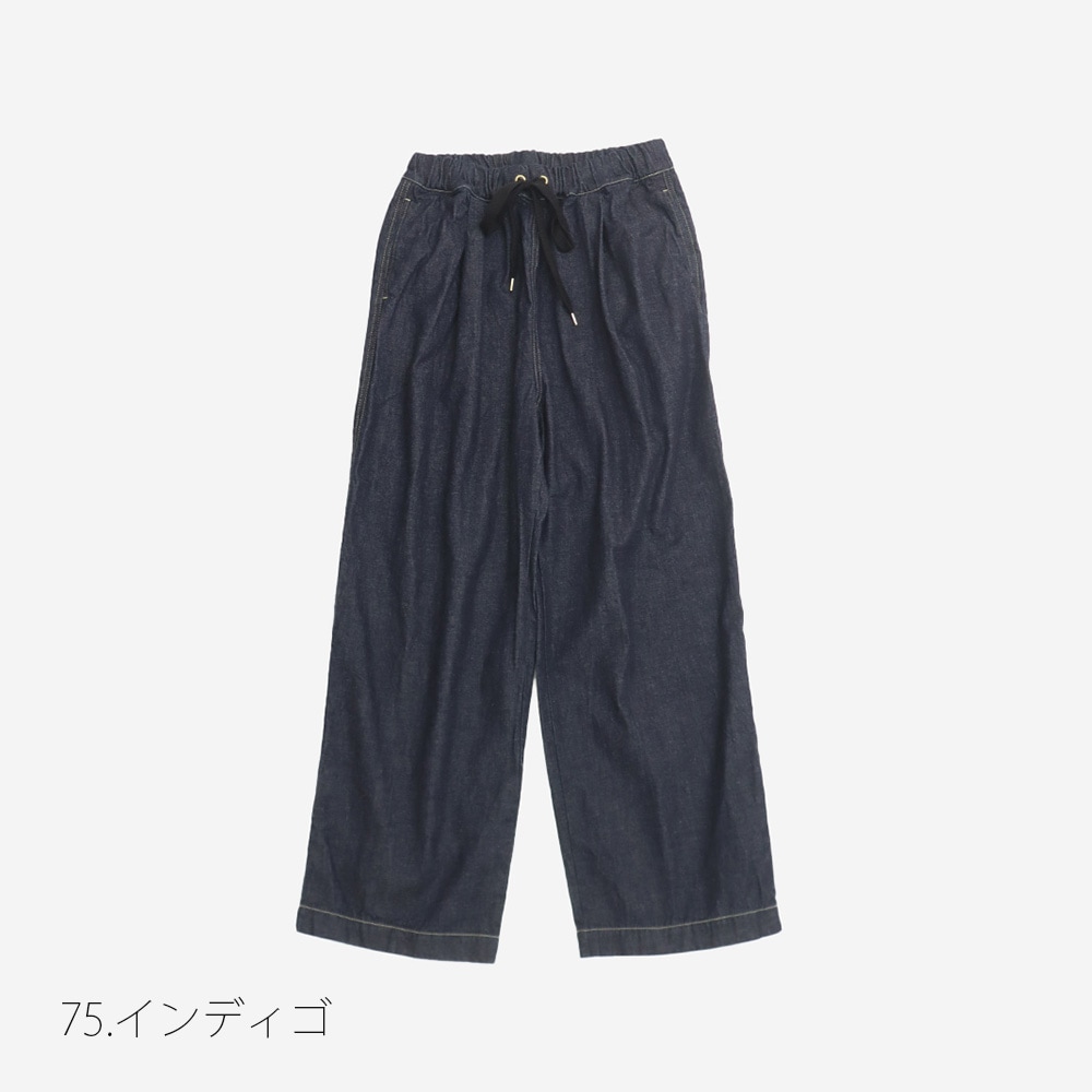 ほどよい厚みでオールシーズン着回せる、8オンスムラデニム イージーパンツです。 リラックス感のある穿き心地ながら、タックと紐リボンが上品さをプラス。ボーダーやシンプルなTシャツと合わせて日常使いに、シャツやジャケットと合わせてお出かけにも。幅広いシーンで着回せる一本です。