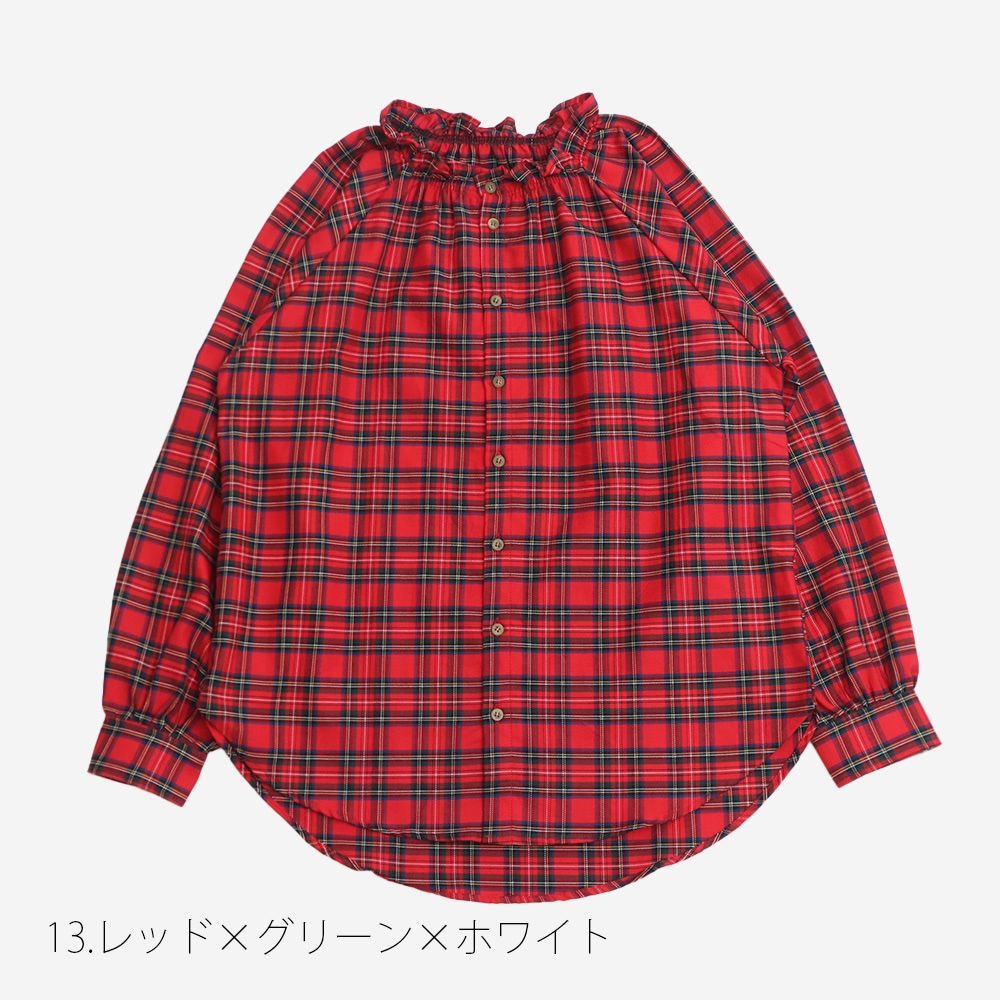 ふんわりやさしい雰囲気をまとう、ロイヤルタータン フリルネックシャツです。一枚で華やかに映える存在感がありながらも、デニムやワイドパンツなど、カジュアルボトムとの相性も抜群。