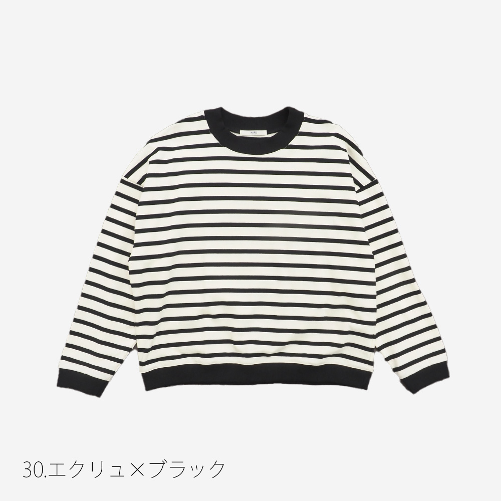 裾リブがつくる自然なメリハリでバランス美人に。ボーダーの幅や配置にこだわり、カジュアルになりすぎない上品さをプラス。子どもっぽく見えず、シンプルなのに大人の抜け感が漂う仕上がりです。