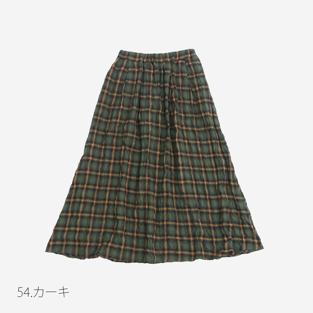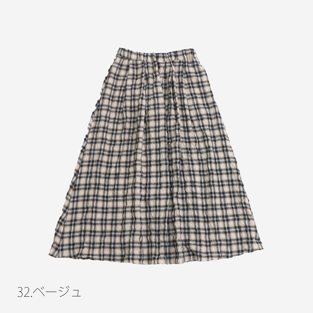 ふんわりとした揺れ感が美しい、へリンボンシャーリングチェック スカートです。ふんわりと波打つような凹凸感のある生地が、動くたびに軽やかに揺れ、チェック柄が秋冬のコーディネートにあたたかみを添えます。