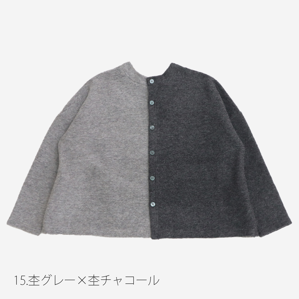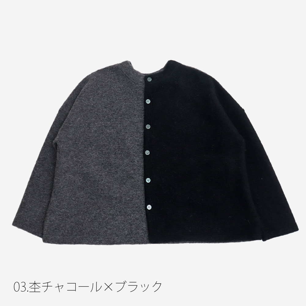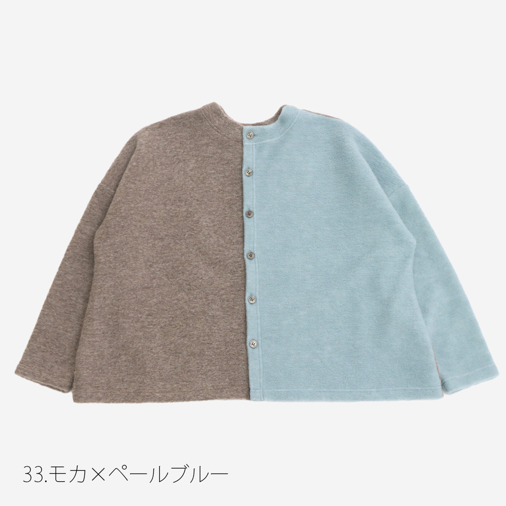 身頃が配色になった、印象的なバイカラーデザイン。ほどよくゆとりのあるシルエットで、軽やかな着心地です。ボタンを前にすればカーディガンとして、後ろにすればプルオーバーのようにも着られる2WAY仕様です。