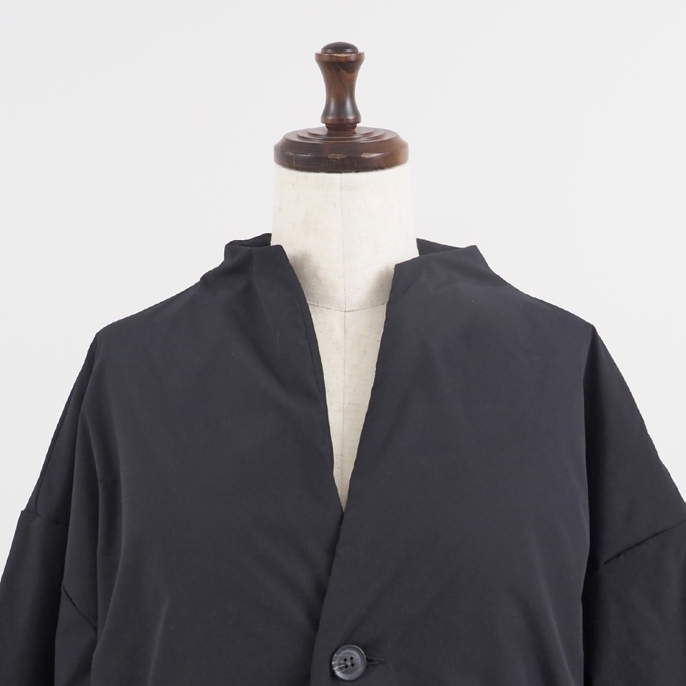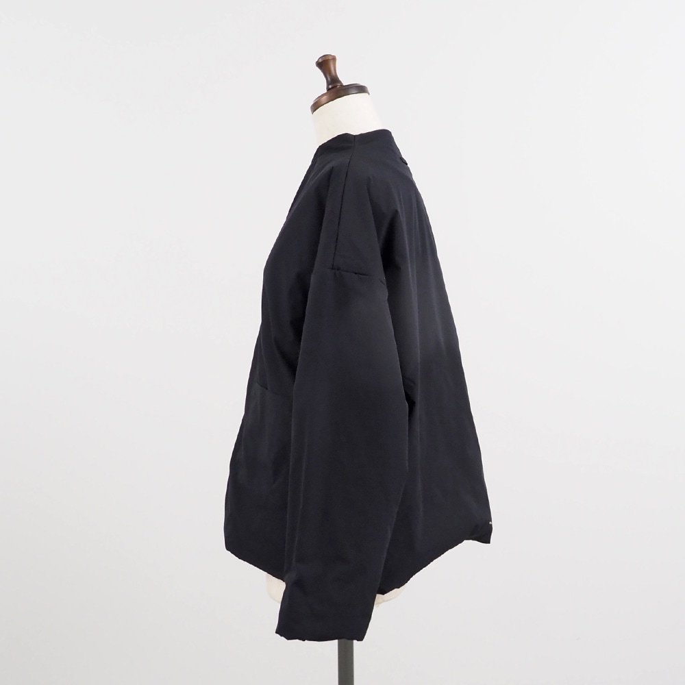 薄手で軽く近年の暖冬にも相性が良いキーネックパデットジャケットです。カーディガンのような軽さなのに、きちんと感はしっかり。ジャケット=堅いというイメージをいい意味で裏切る、ふわっと軽やかな着心地です。