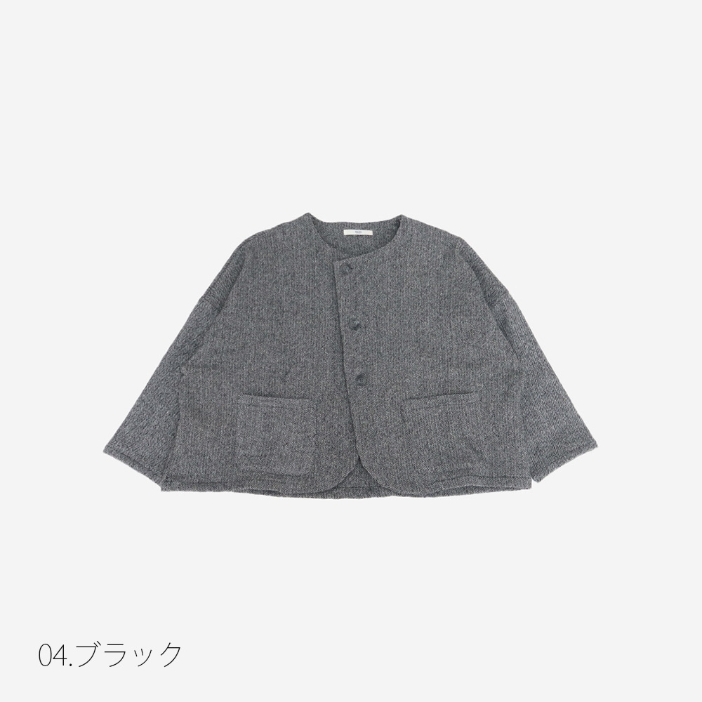 ヘリンボーン織りにネップの表情を効かせたツイード素材を、ワイドな身幅と丸みのあるシルエットで仕立てた、軽やかさと温もりを併せ持つジャケットです。前身ごろを斜めに重ねたデザインで、留めたときも自然な動きとさりげない立体感が生まれるのが特徴です。