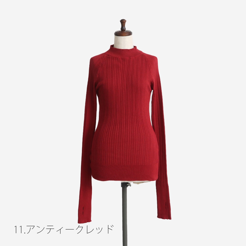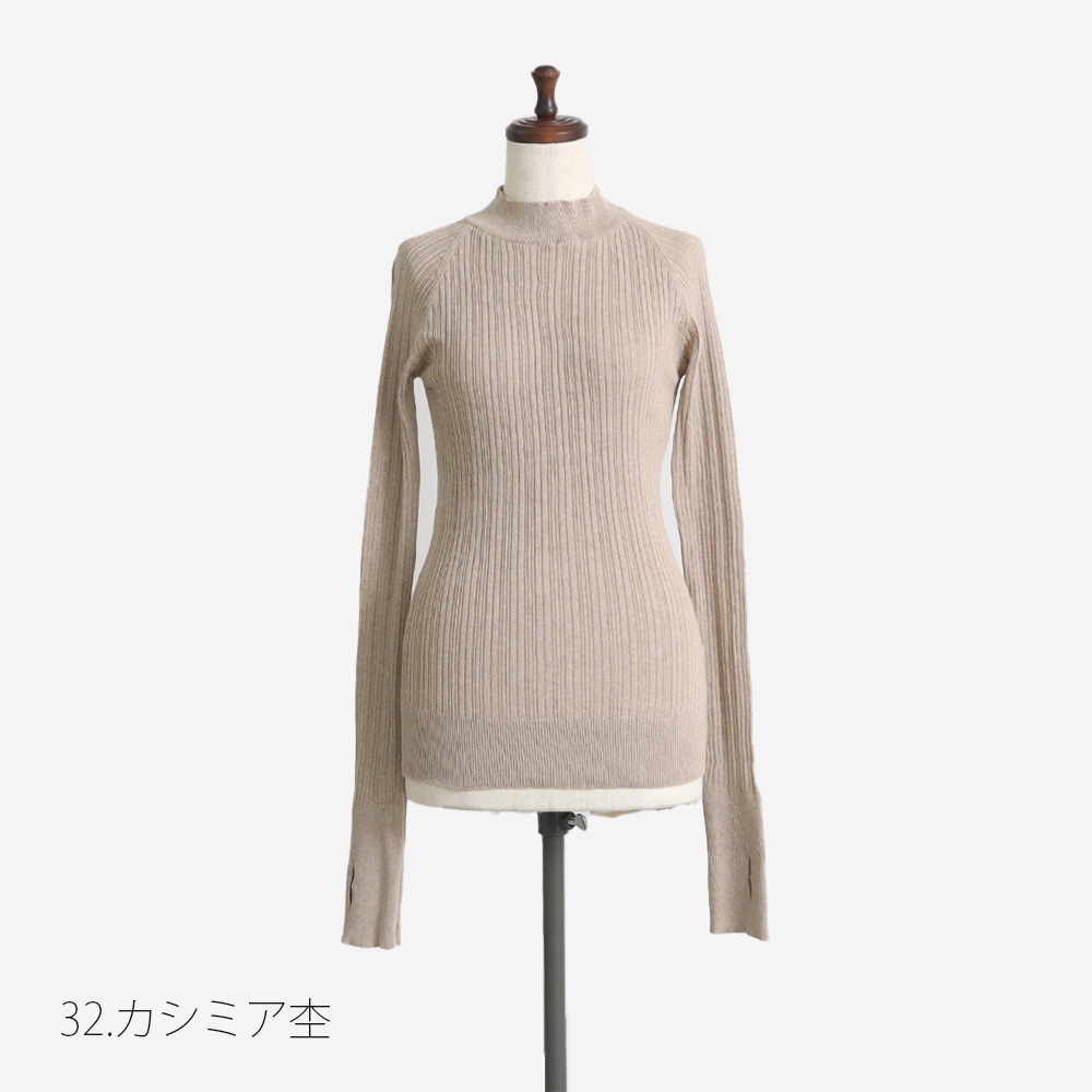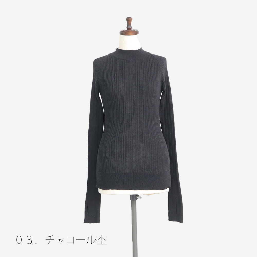 ランダムリブの凹凸がやさしく体に沿い、サムホール付きの長め袖が手元まで包み込んで、着るたびにほっとするディテールです。