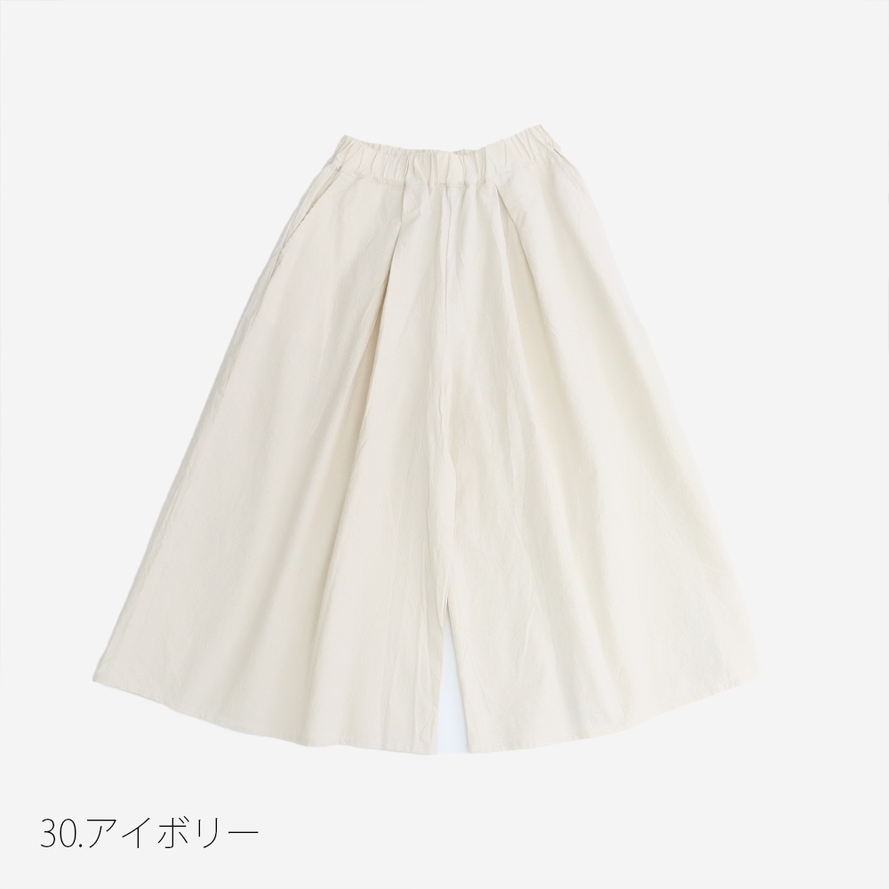 ウエストはやさしく身体にフィットする総ゴム仕様で、リラックスしたはき心地に。フロントには2本のタックを施し、腰まわりにゆとりを持たせながら、ふんわりと美しいシルエットをつくります。